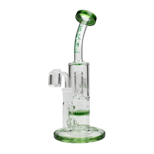 This 8" Xtreme Glass rig boasts an impeccable construction with its quality borosilicate glass, Dome percolator, honeycomb diffuser and quartz banger, and stemless bent neck design. Providing versatility and diversification, this bubbler also comes gifted in a box of an assorted design.